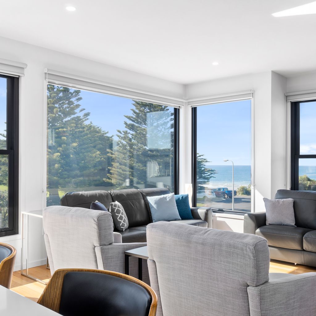 Across two levels, there are two living areas, two TVs, three bedrooms, 3 bathrooms and additional powder room, ocean view patio, sheltered entertaining deck with Weber BBQ, and full kitchen with dishwasher and coffee machine.