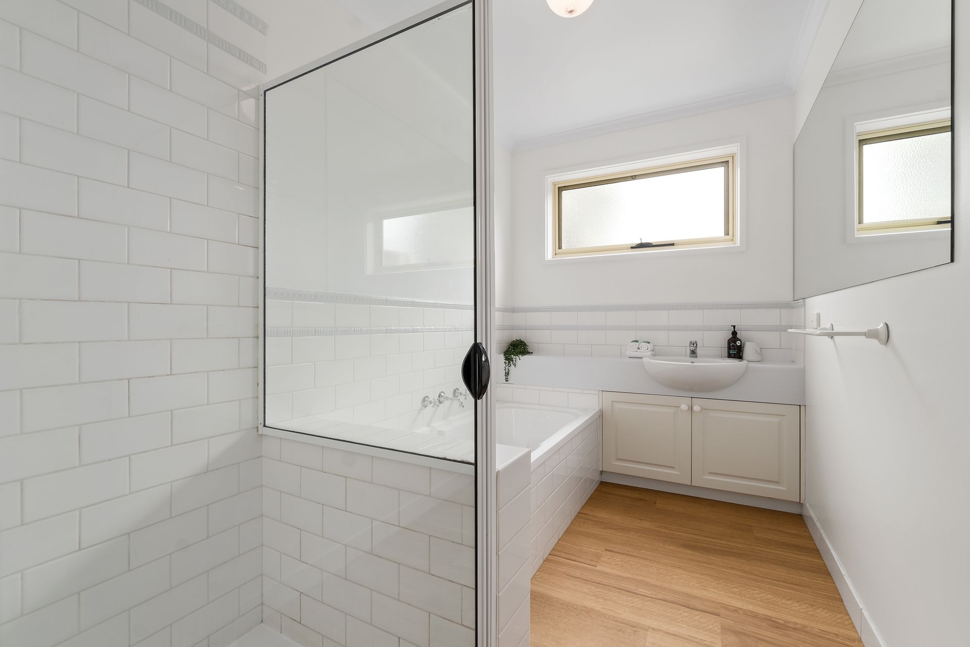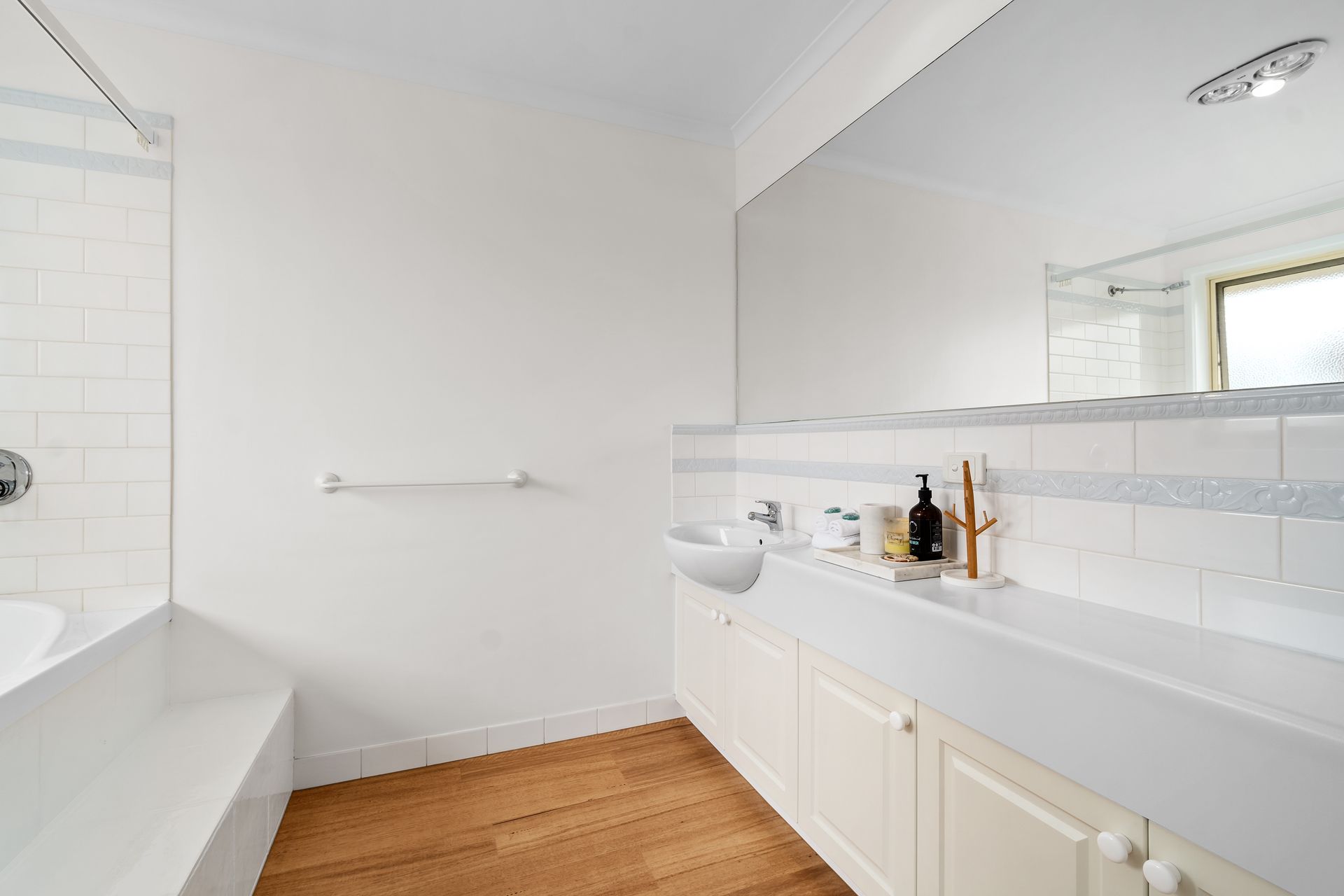 The family bathroom on ground level has a bath and separate shower, vanity and large mirror. There is also a separate toilet.