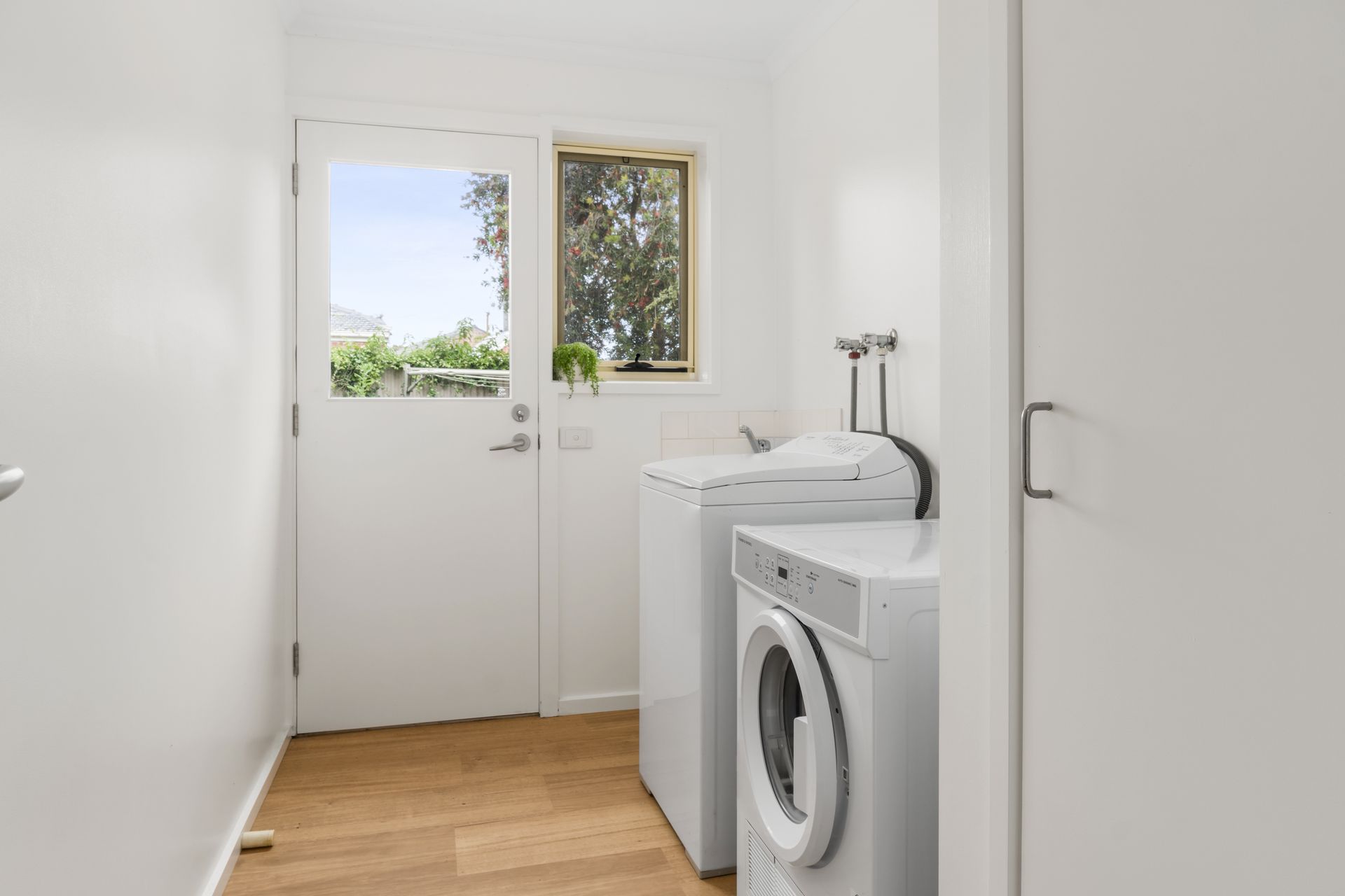 A laundry room has a washing machine and dryer, iron and ironing board, and direct access out to the backyard with clothesline.