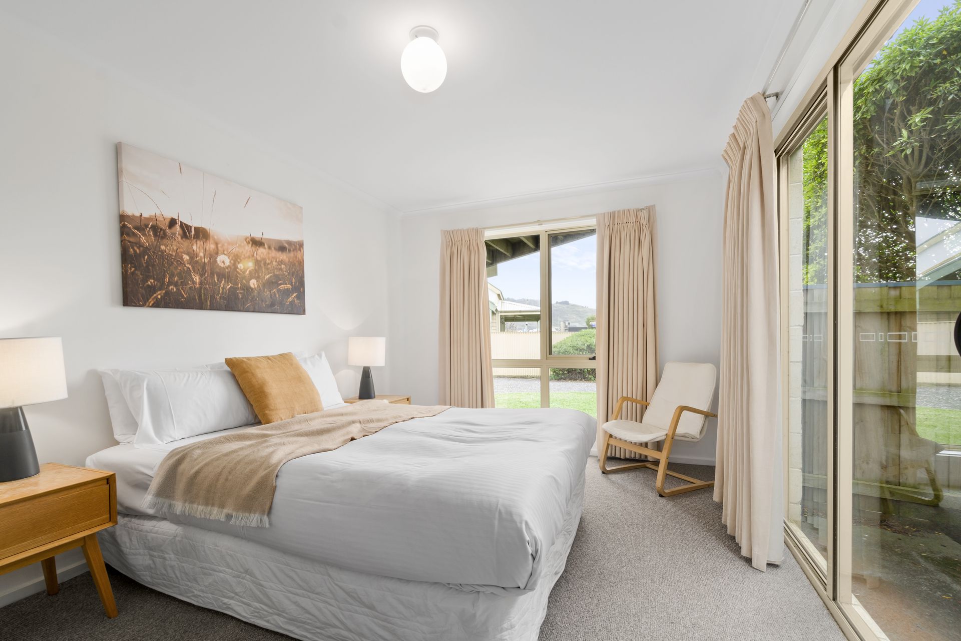 One large bedroom with a queen bed and glass sliding door access directly to the backyard.