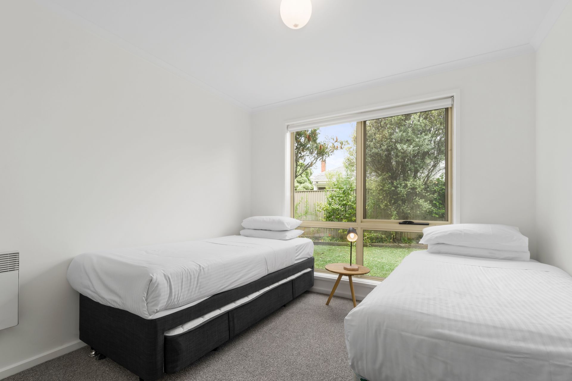 Both downstairs bedrooms are light filled and have wall mounted electric heaters. All bedrooms have build in wardrobes and full block out curtains or blinds.