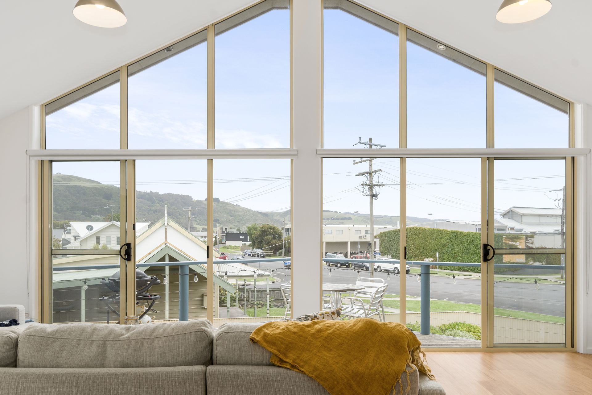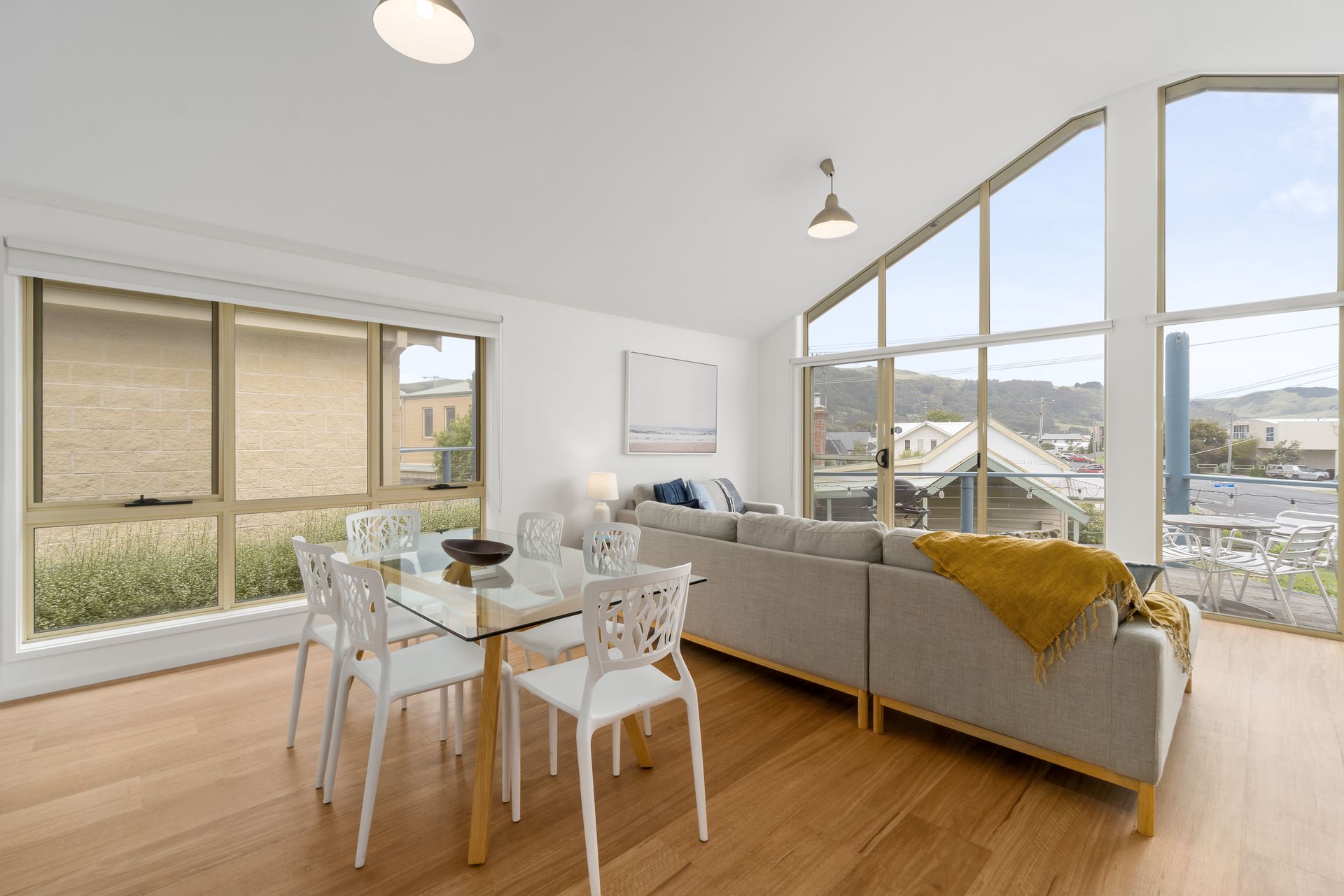 A beautiful North facing sunlit open plan living area upstairs enjoys views of the ocean, Marriners lookout, and the green rolling hills of Apollo Bay.