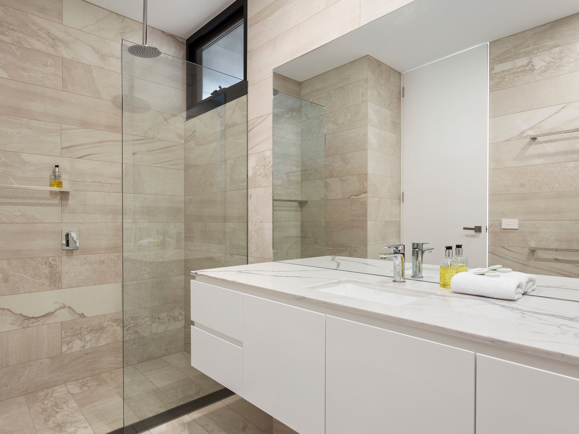 Upstairs area is entirely an open living, kitchen and dining space which invites you to sit down, relax and take in the multiple viewpoints. The sitting area has an iconic Great Ocean Road aspect, framed beautifully by the floor to ceiling double glazed windows. The adjoining timber dining table also enjoys the same aspect, making shared meals with loved ones here even more memorable. At the other end of the room is the lounge area featuring a sandstone stacked wall with inbuilt gas log fireplace. Sit back on the tan leather couches and enjoy a movie on Foxtel or streaming via the Smart TV and fast fibre to the node NBN wireless internet. Or enjoy a book sitting at the library wall with another framed view - this time of Sturt Point and Wye River.