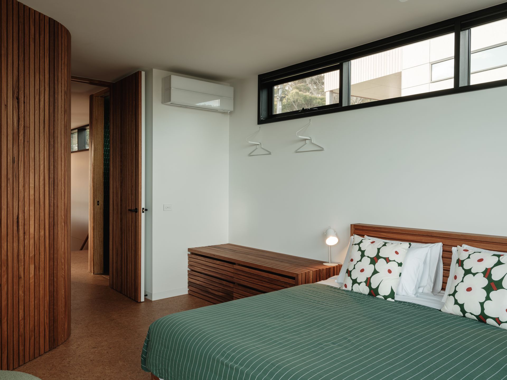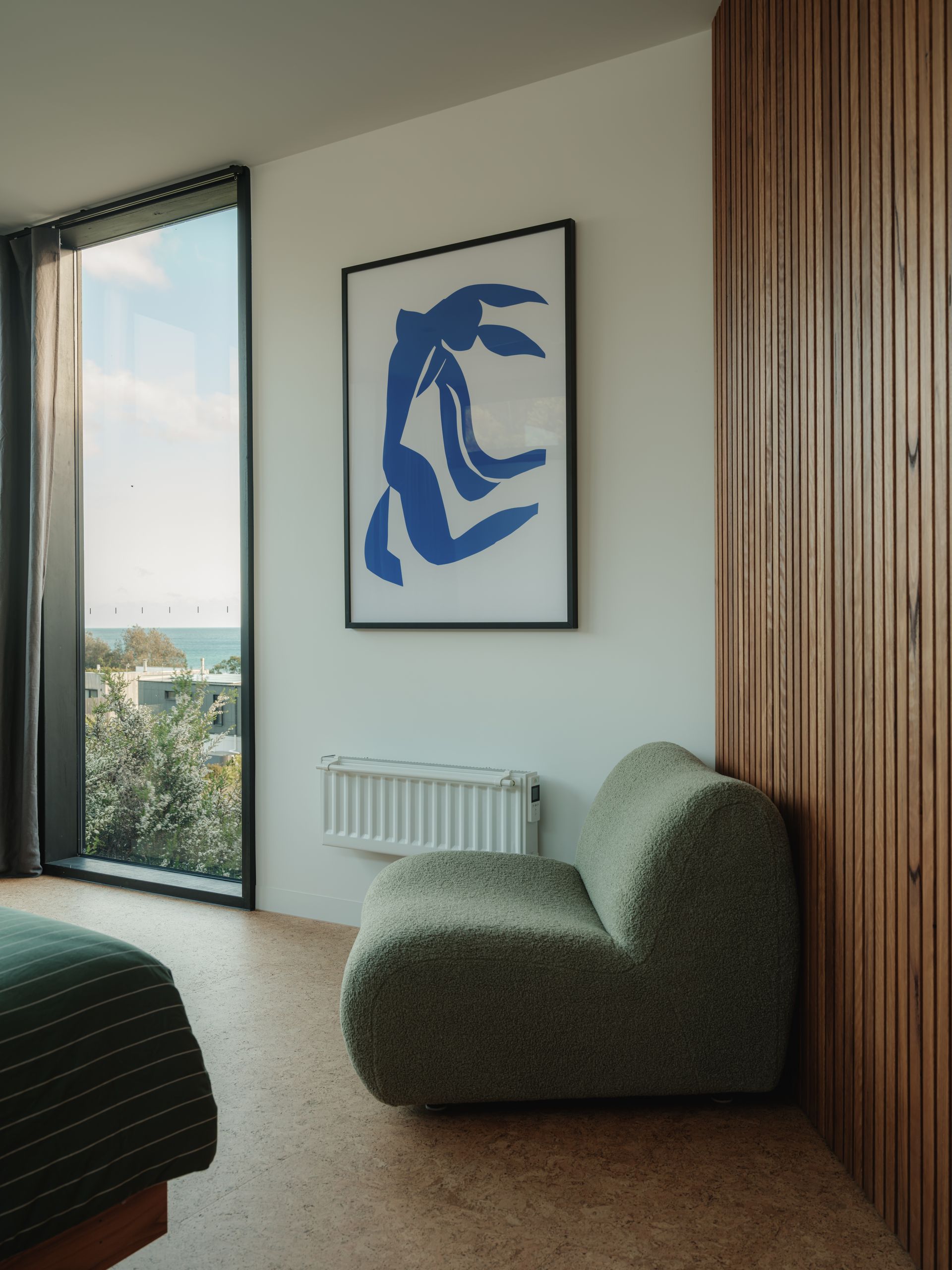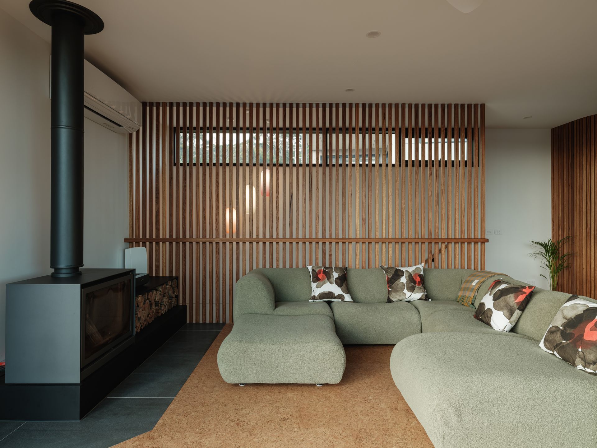 Obliqua is powered by 9kW of grid-connected solar panels with a 10kW Tesla Powerwall battery. If the power goes out, the battery will automatically power the house for a time. The house has LVI electric heaters throughout, as well as underfloor heating in the bathrooms, heated towel rails, and reverse cycle air conditioners upstairs in the living area and main bedroom.