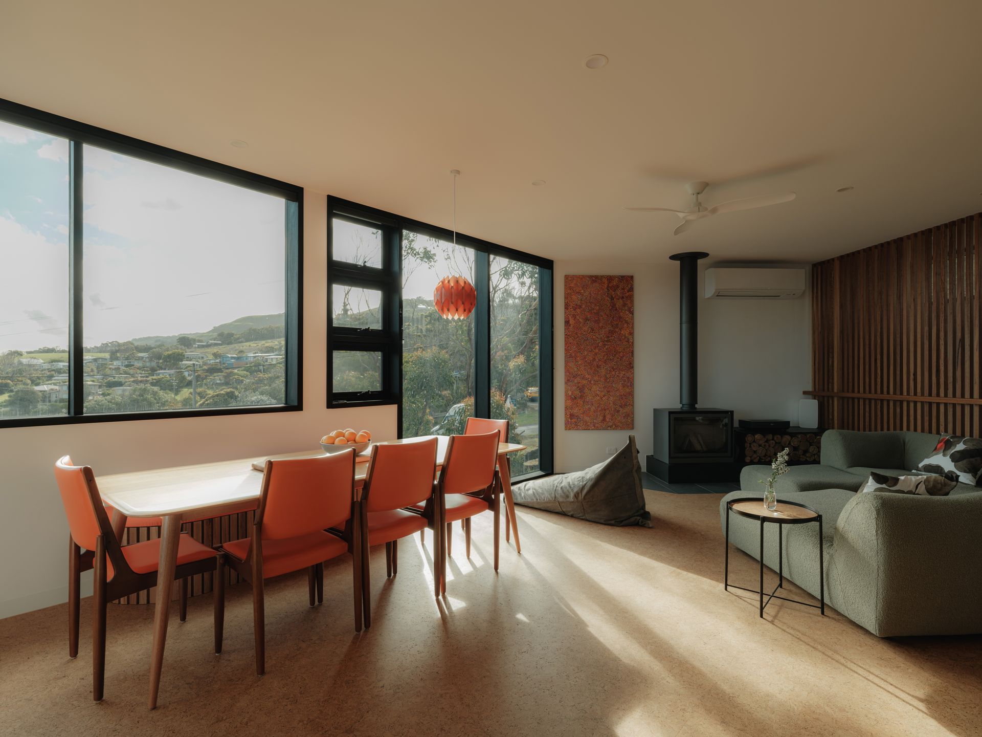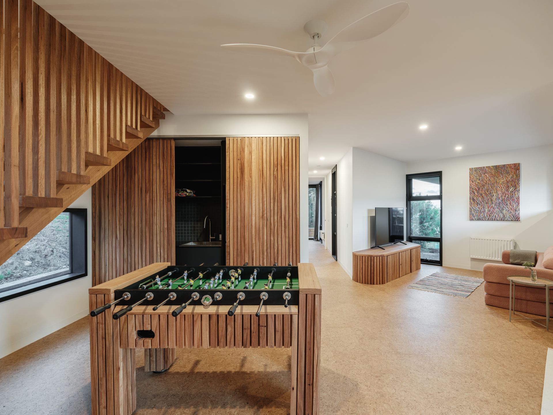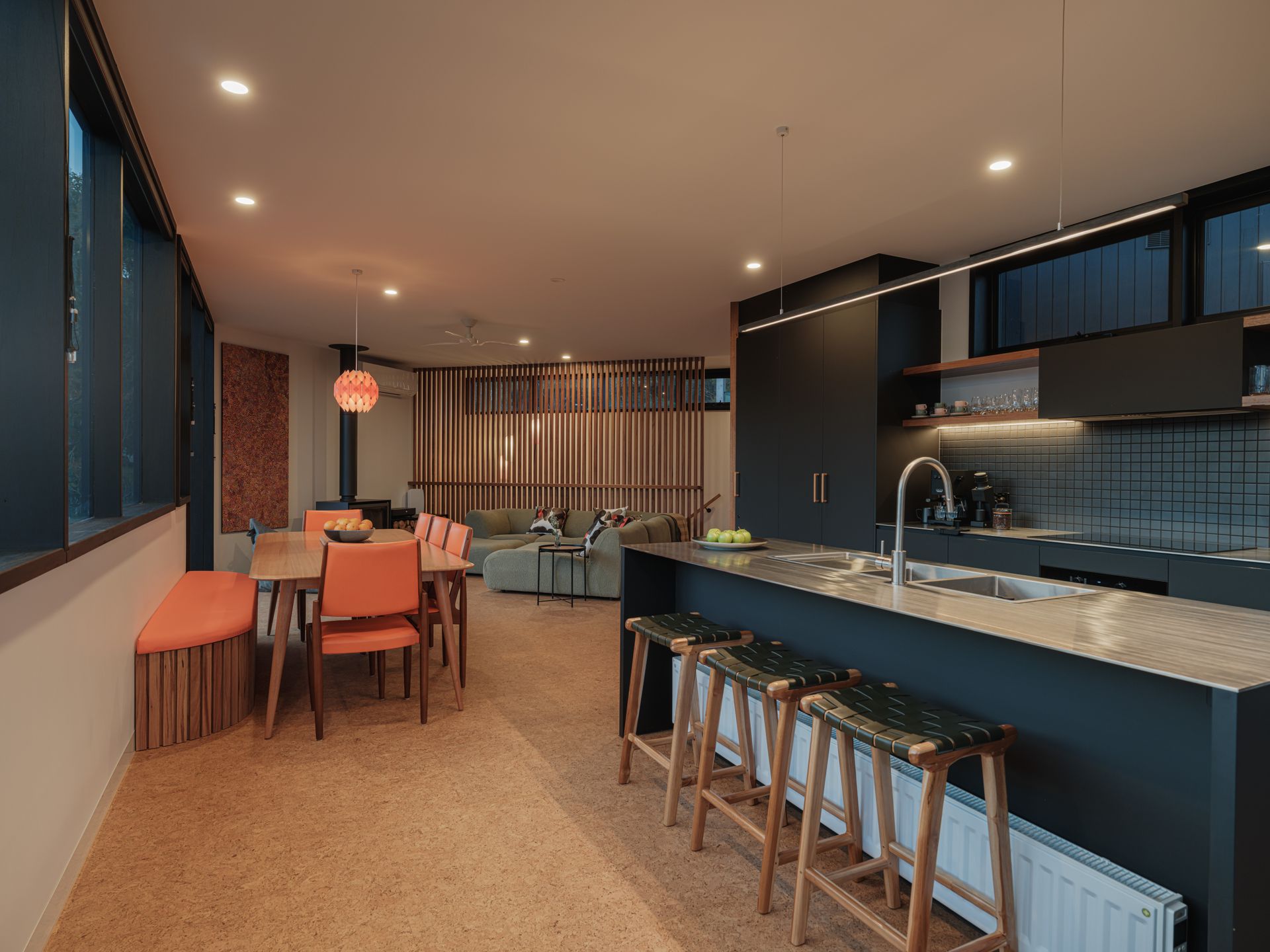 sets the tone for guests to unwind and discover the home's many comforts. Materials, textures, colours and views combine in creating the home's easy-going atmosphere. The sustainable cork flooring throughout creates warmth and a welcome backdrop for the playful bursts of vibrant colours - from the glossy green leaf-shaped tiles in the powder room to the orange vinyl dining furniture. There are matte textures of terra-cotta in the ensuite and sleek black kitchen cabinetry. Bold stripes are on theme in the ground floor bathroom and kids are catered for with bunks, a pull-apart modular cubby couch and integrated games cabinet and soccer table.