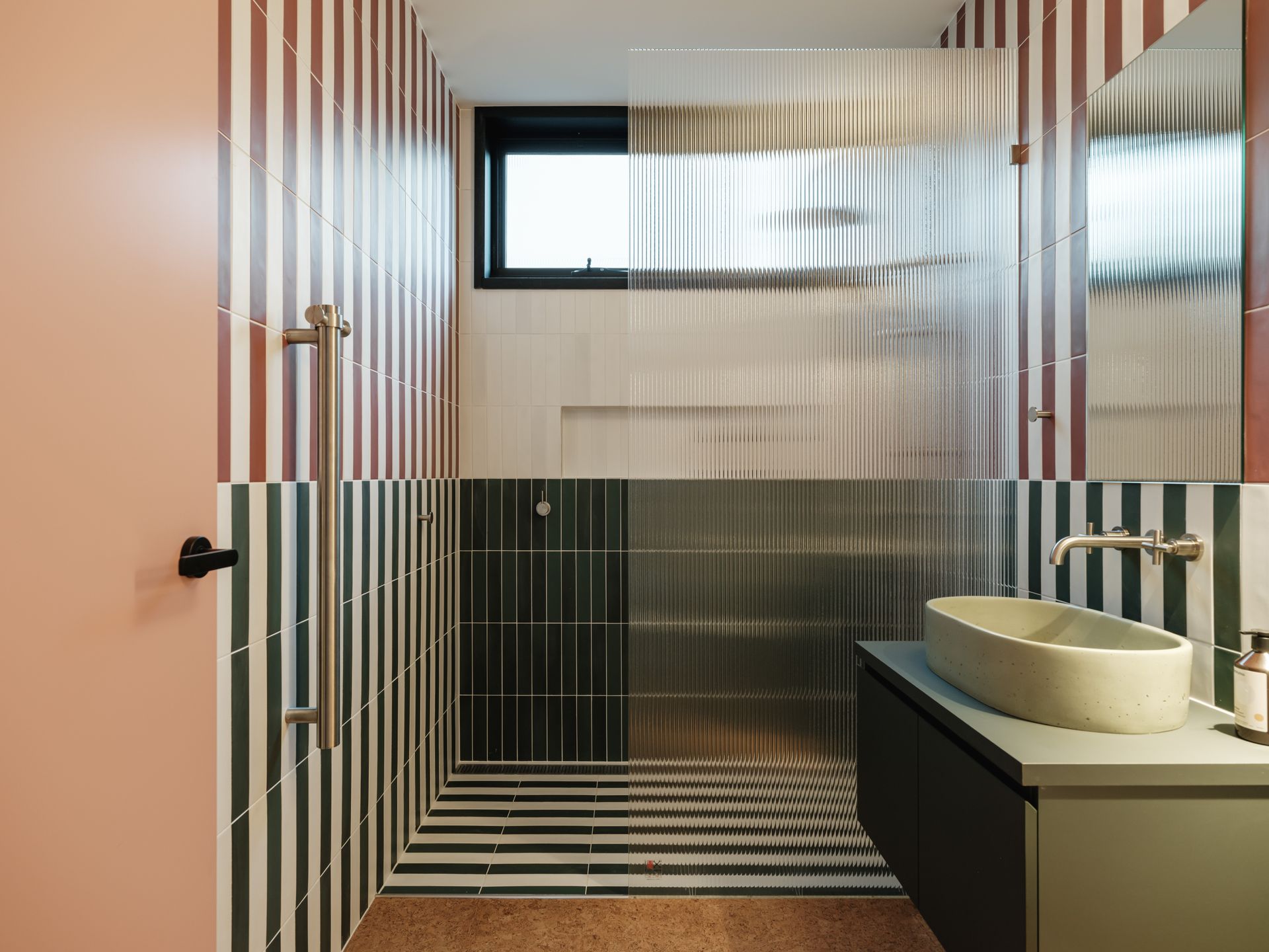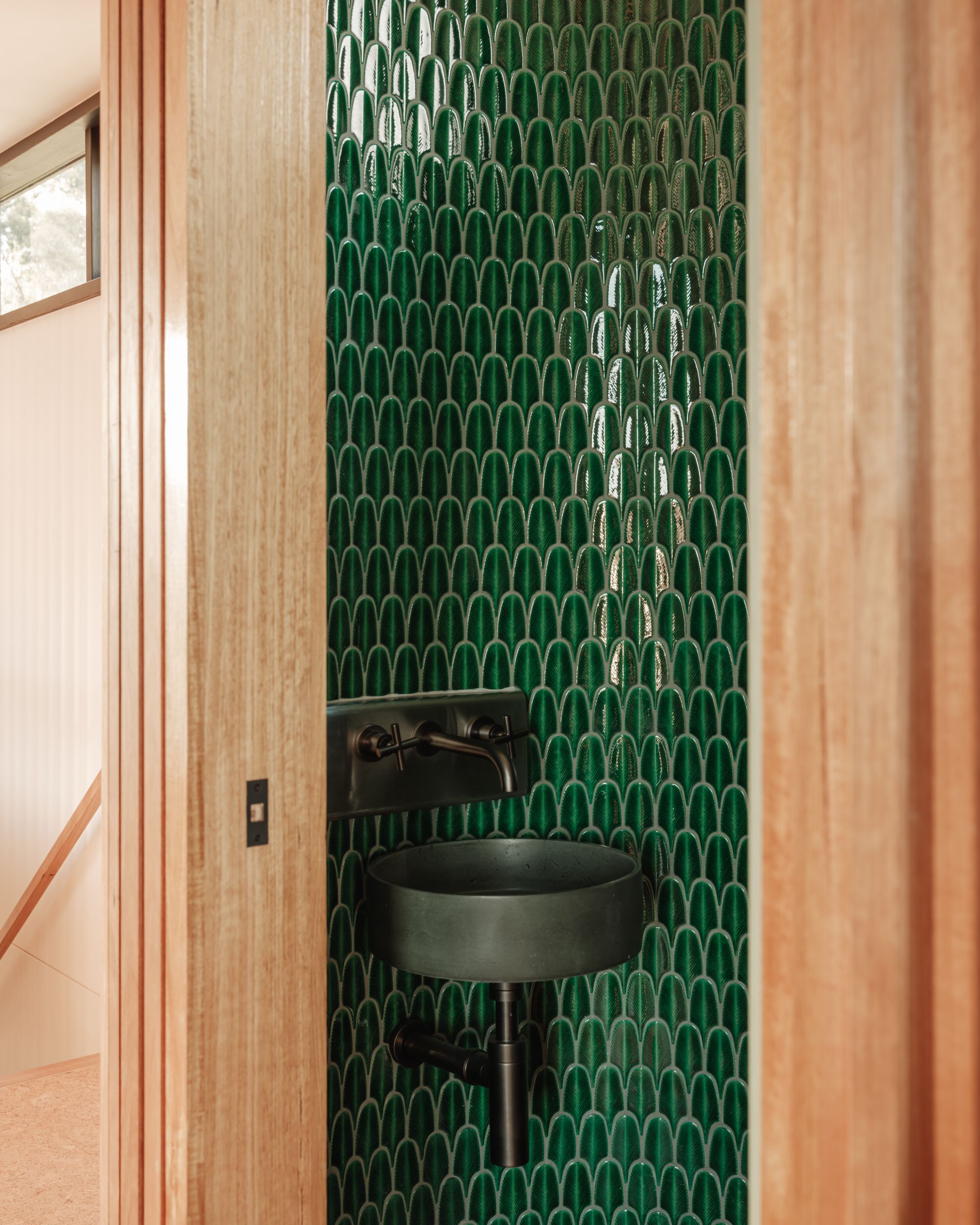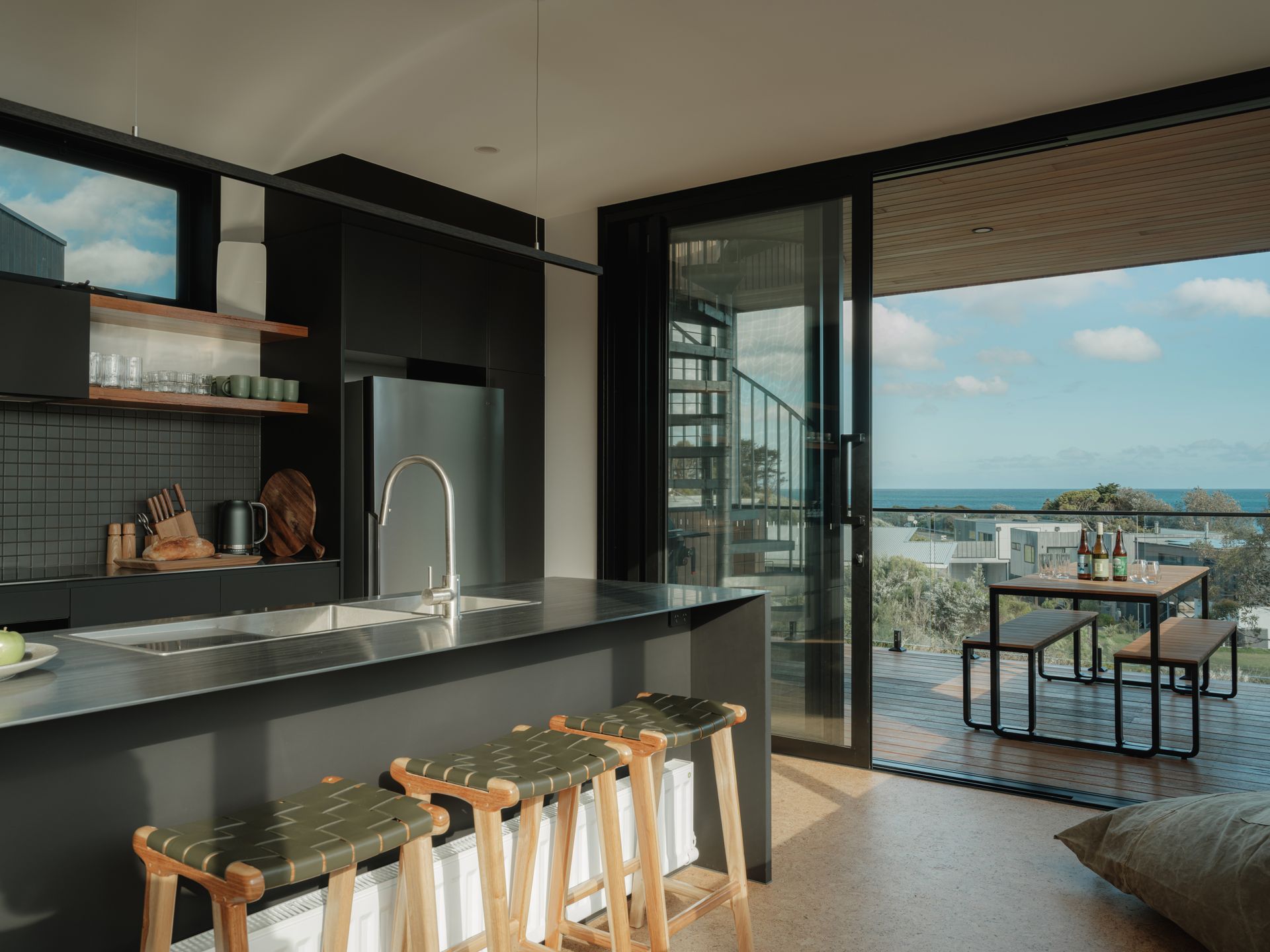 sets the tone for guests to unwind and discover the home's many comforts. Materials, textures, colours and views combine in creating the home's easy-going atmosphere. The sustainable cork flooring throughout creates warmth and a welcome backdrop for the playful bursts of vibrant colours - from the glossy green leaf-shaped tiles in the powder room to the orange vinyl dining furniture. There are matte textures of terra-cotta in the ensuite and sleek black kitchen cabinetry. Bold stripes are on theme in the ground floor bathroom and kids are catered for with bunks, a pull-apart modular cubby couch and integrated games cabinet and soccer table.