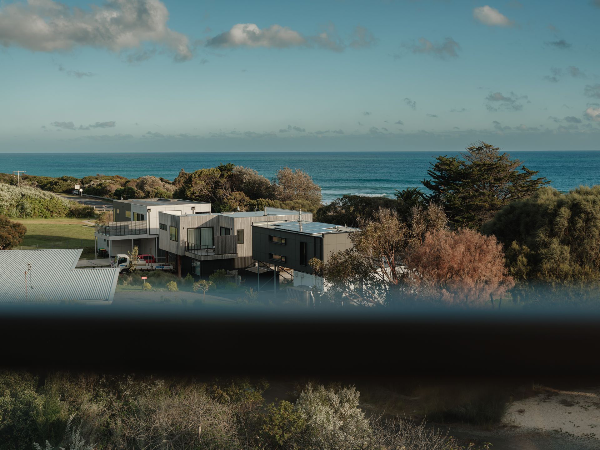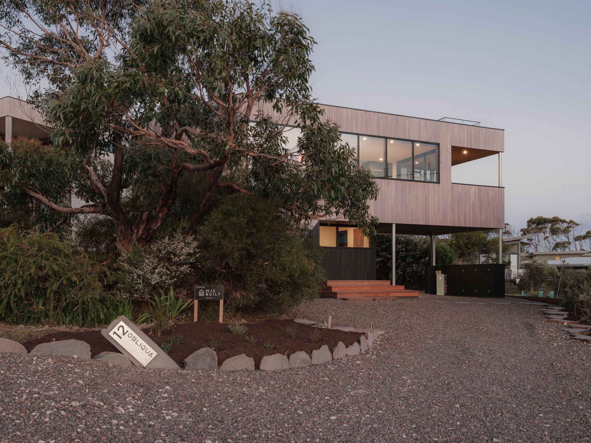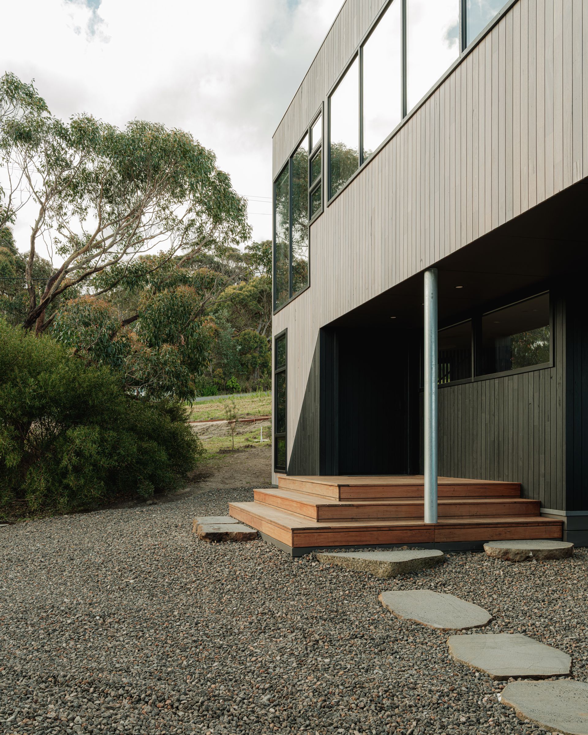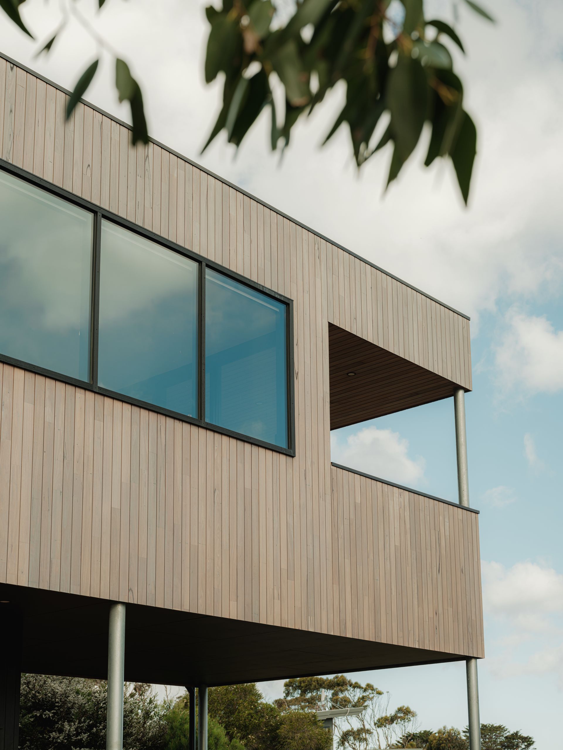 Tucked behind a magnificent Messmate, eucalyptus Obliqua which is indigenous to the area, this house of architectural oblique angles sits at the base of the Otway Ranges, just a few minutes’ walk from the beach.