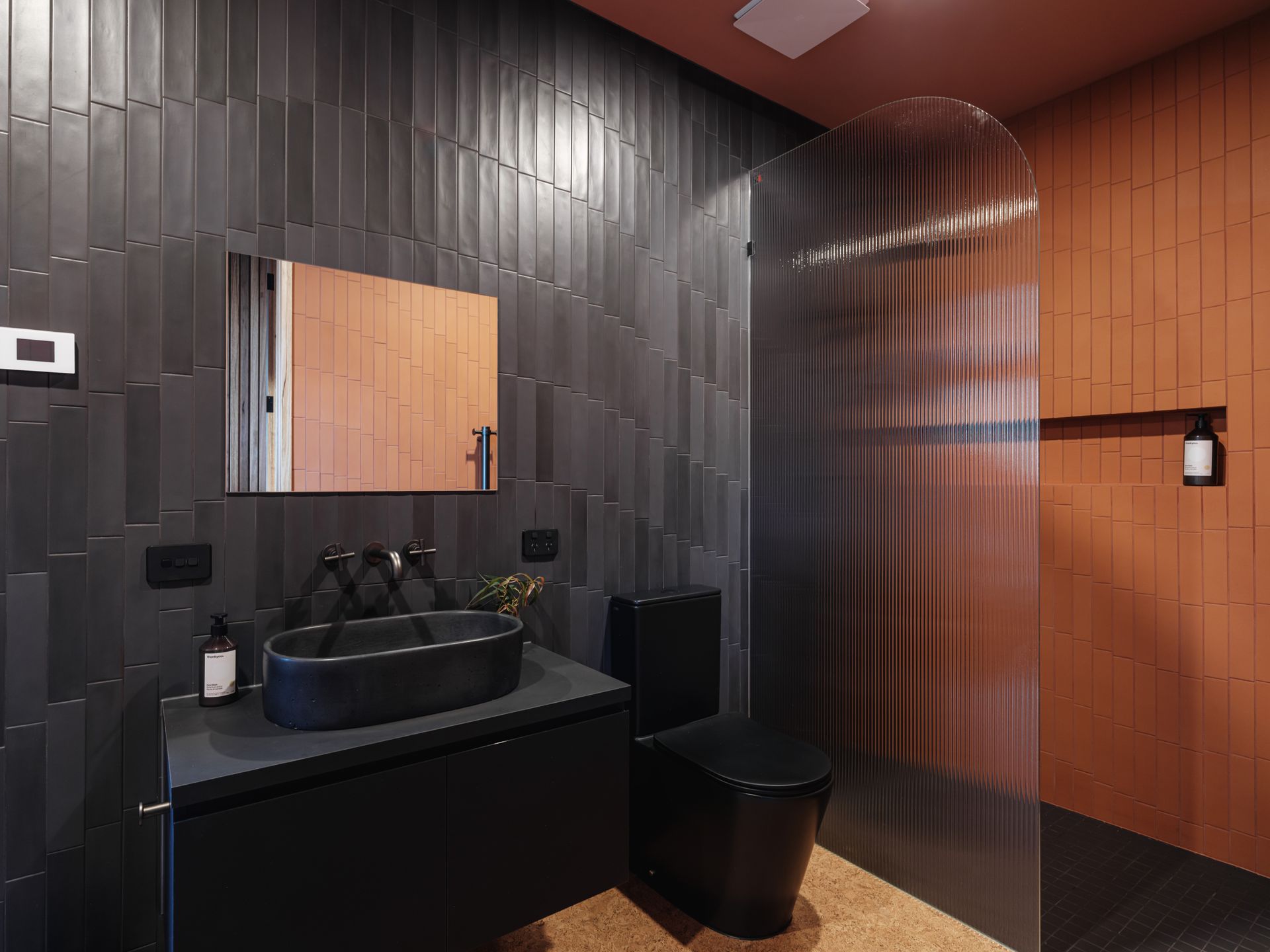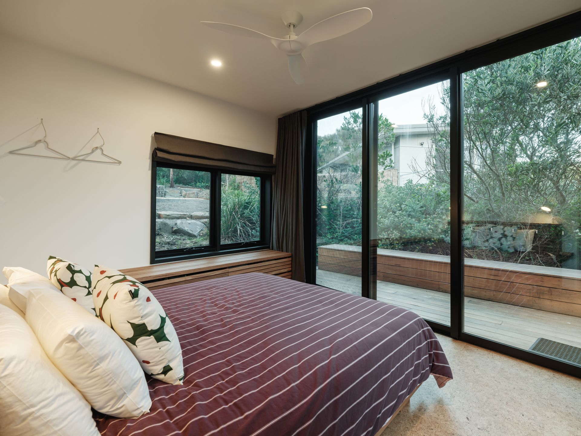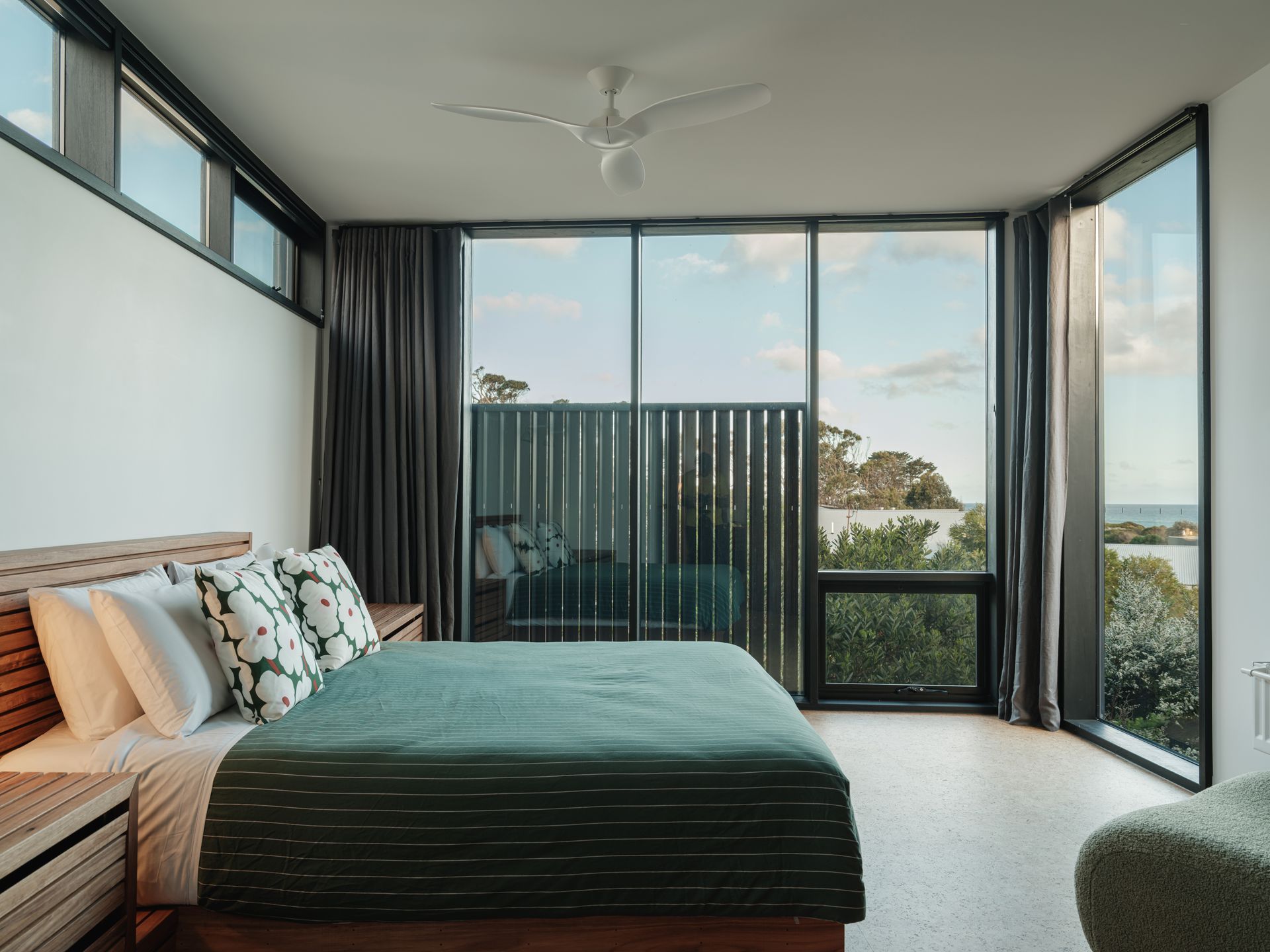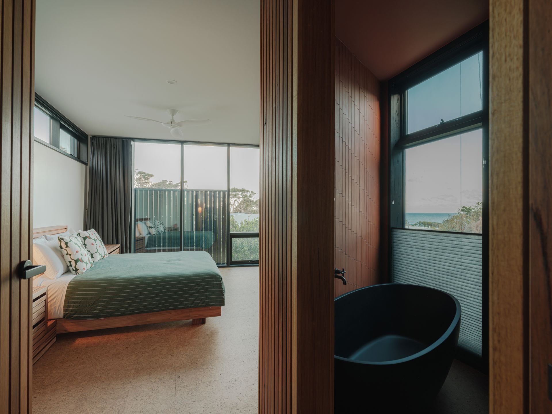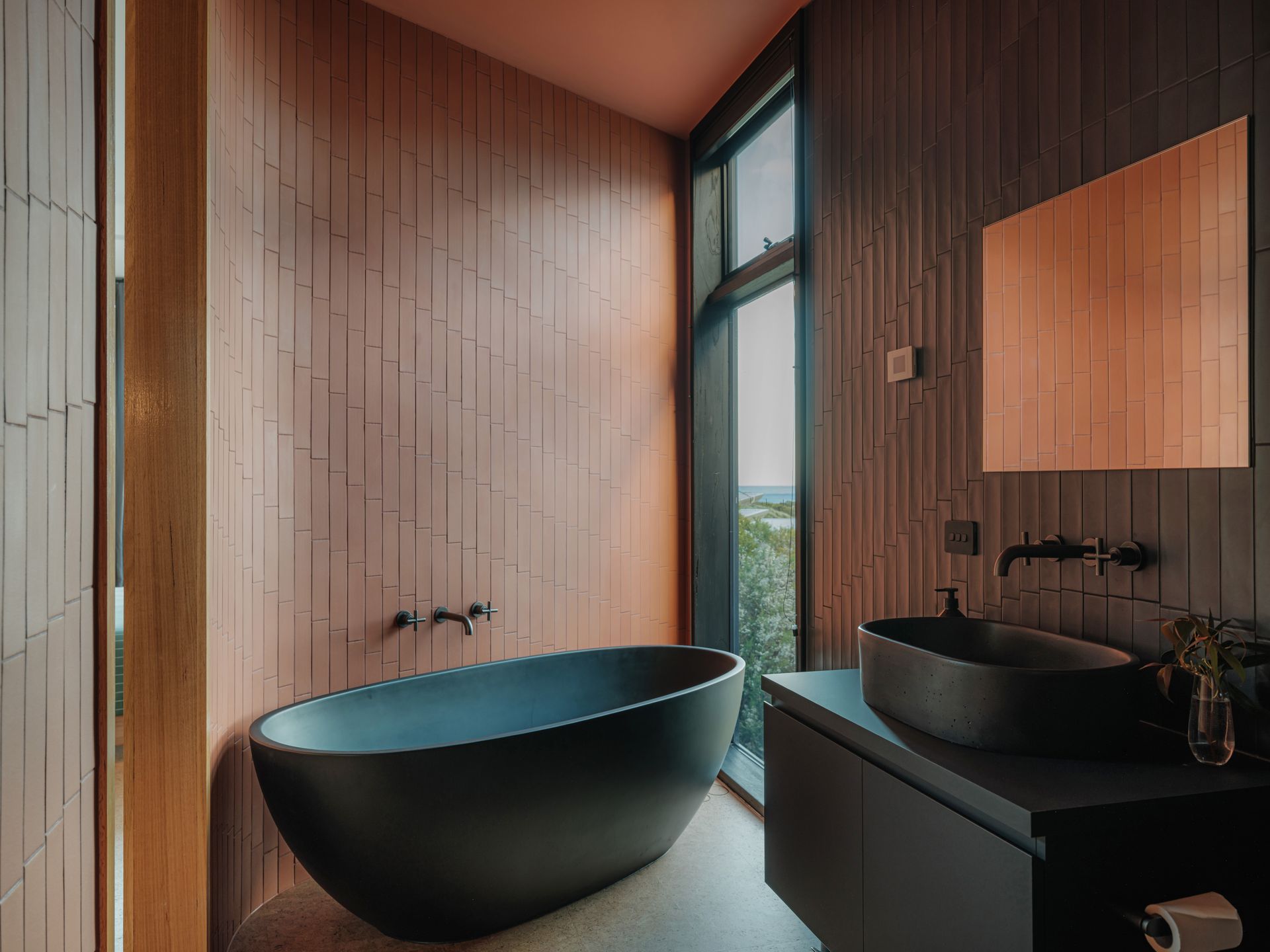 Upstairs, the main queen bedroom enjoys East facing ocean views, capturing the morning light. The statement ensuite bathroom of terracotta and black features a deep bath with ocean views and walk in shower. On the entry level is the second queen bedroom, which also faces East and features large sliding doors onto a patio, as well as the bunk room.