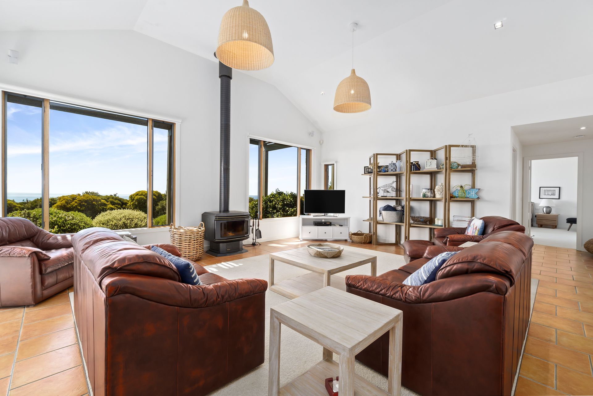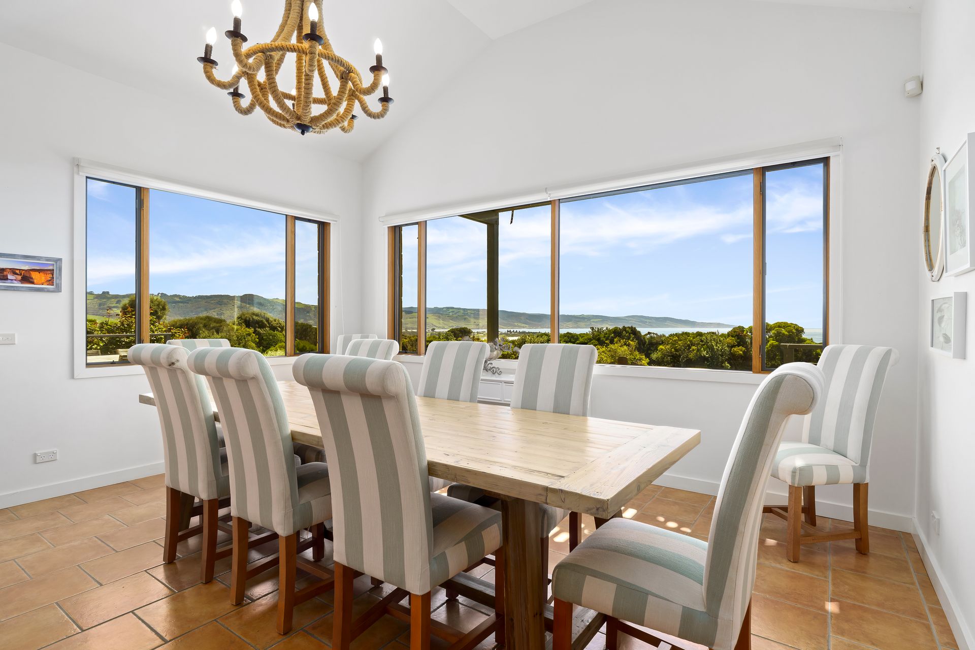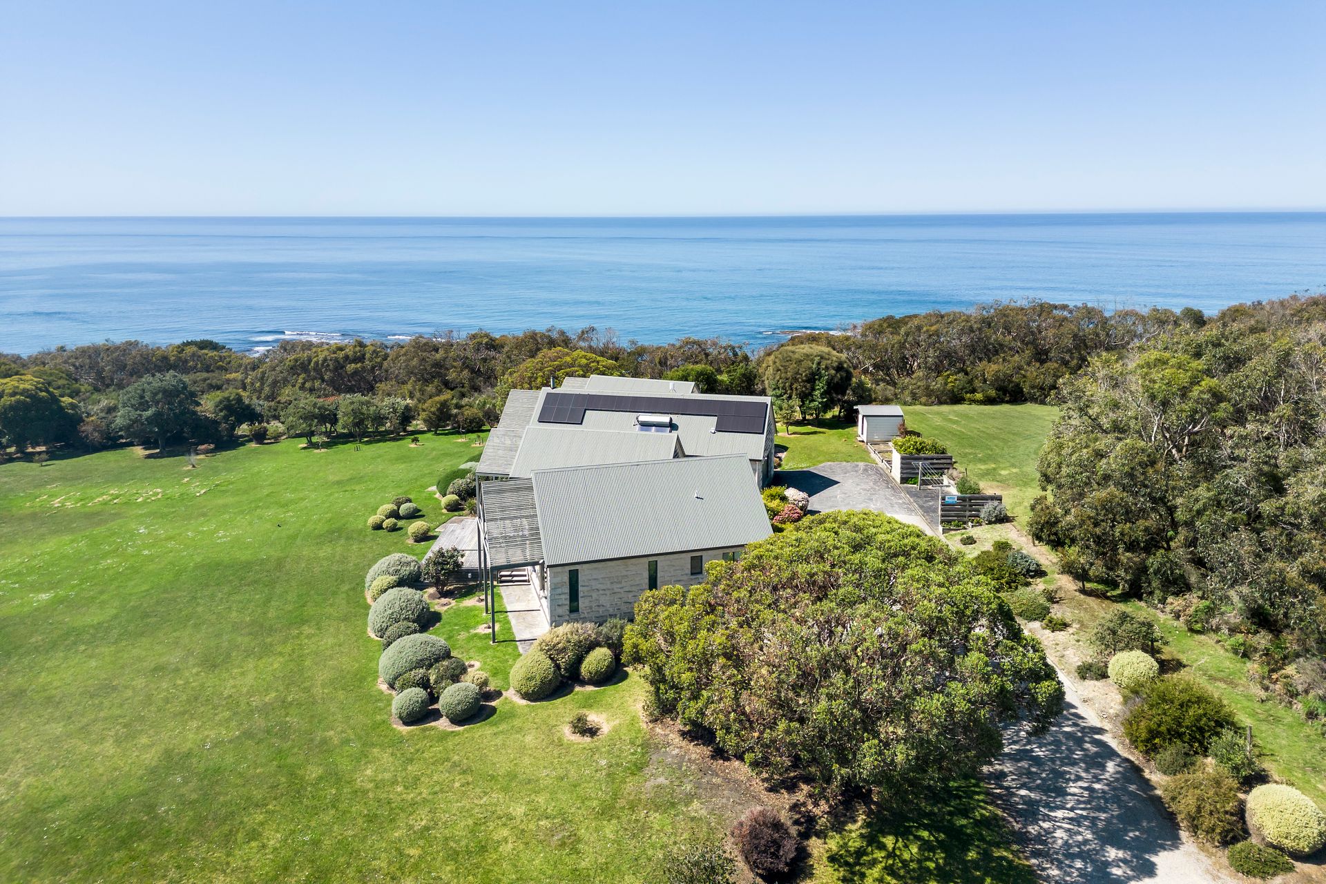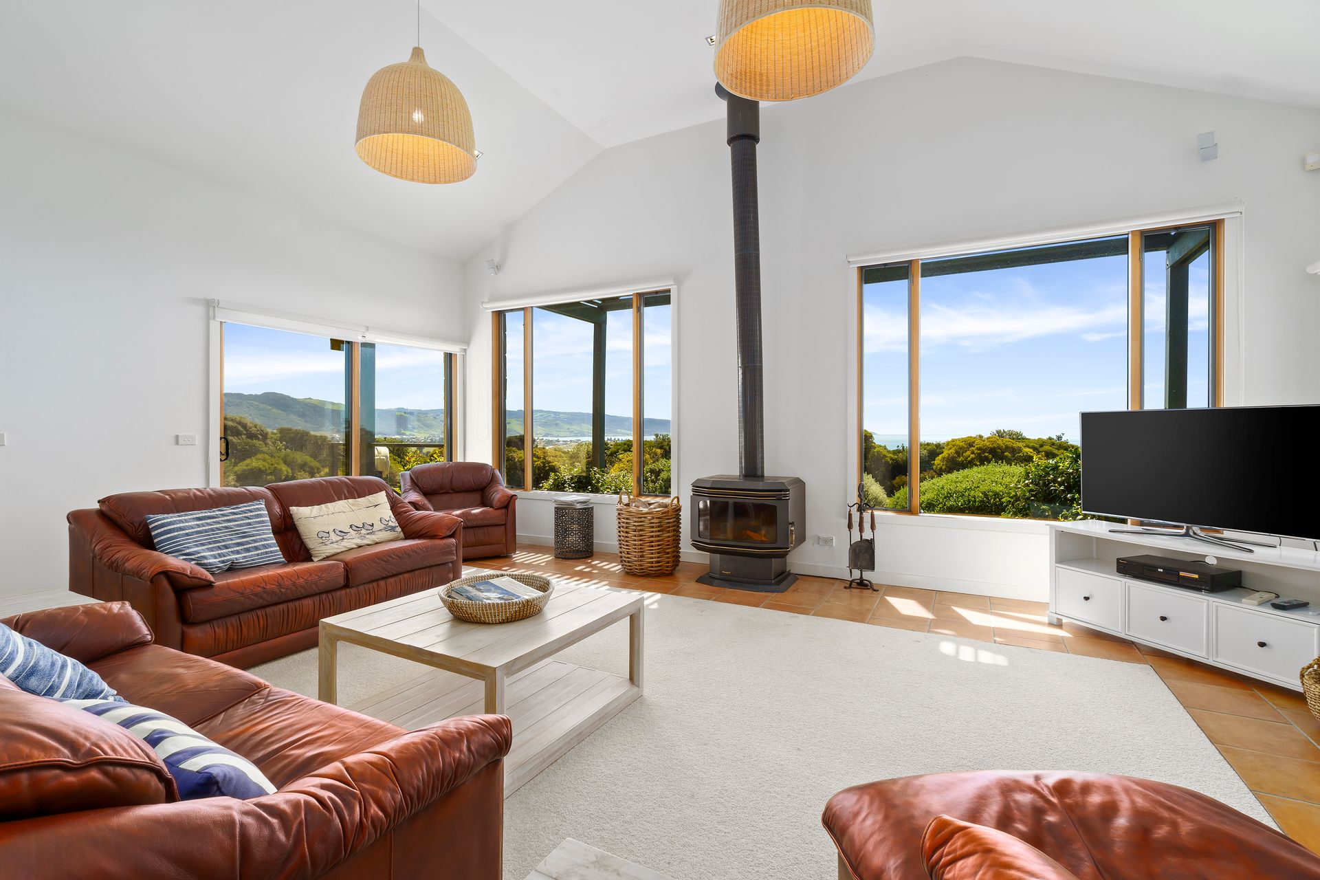 The sandstone home is all on one level, and thoughtfully designed to make the most of the aspect and views to Apollo Bay, Marengo and the surrounding hills. Off a central entry point, there are two wings of the house, with rooms leading onto a front timber deck stretching along the entire length of the house.