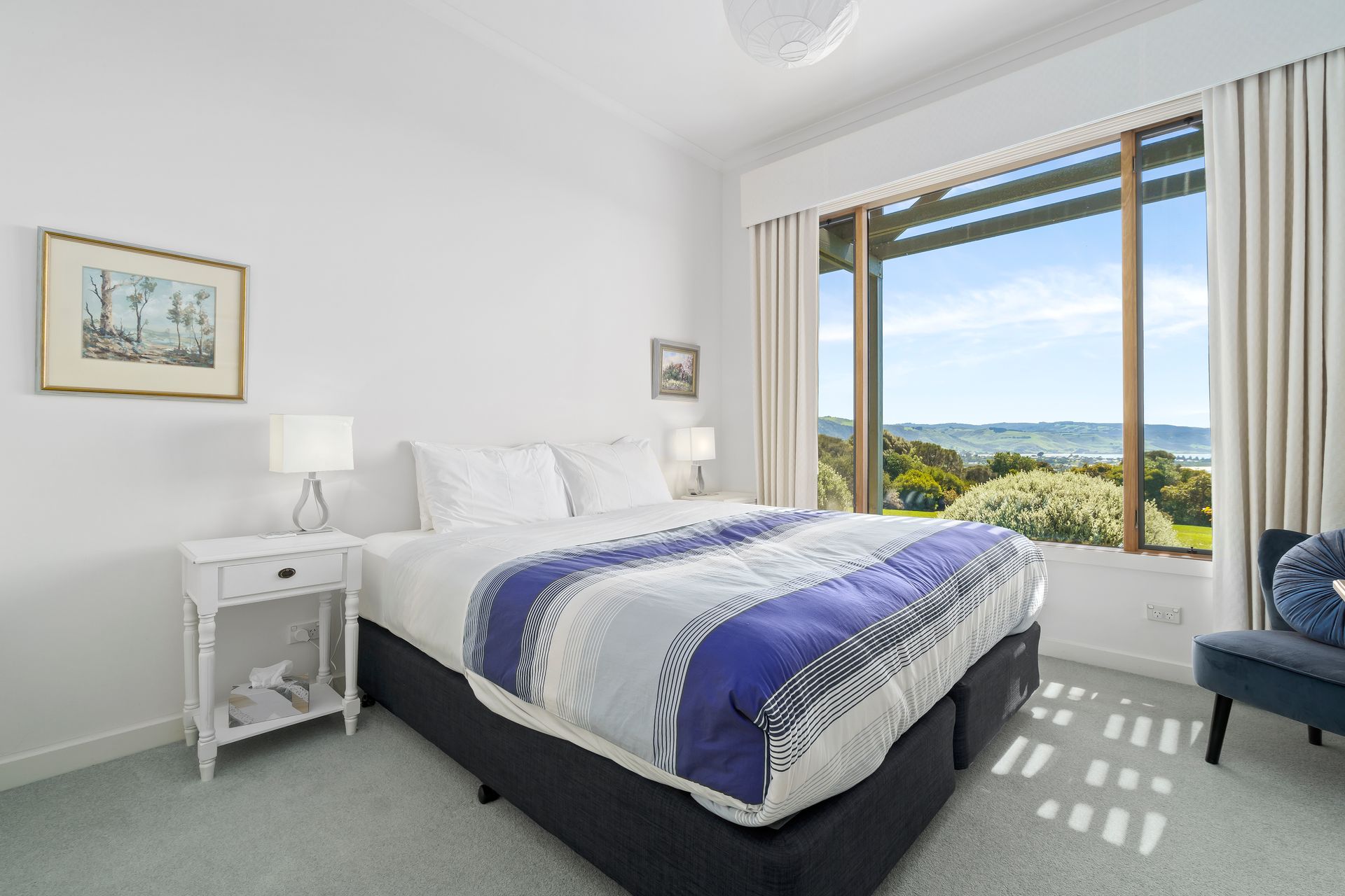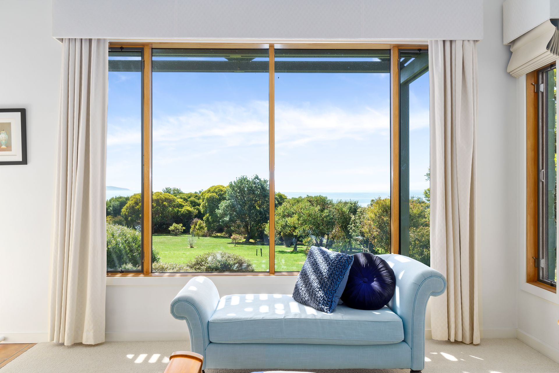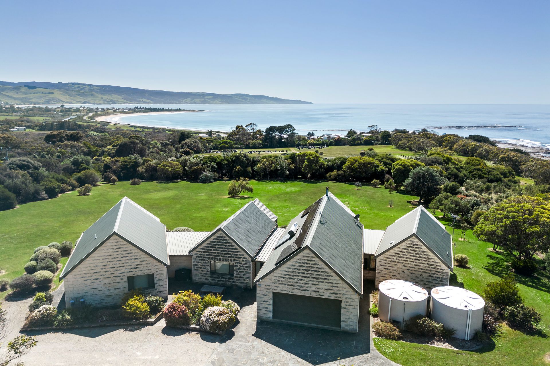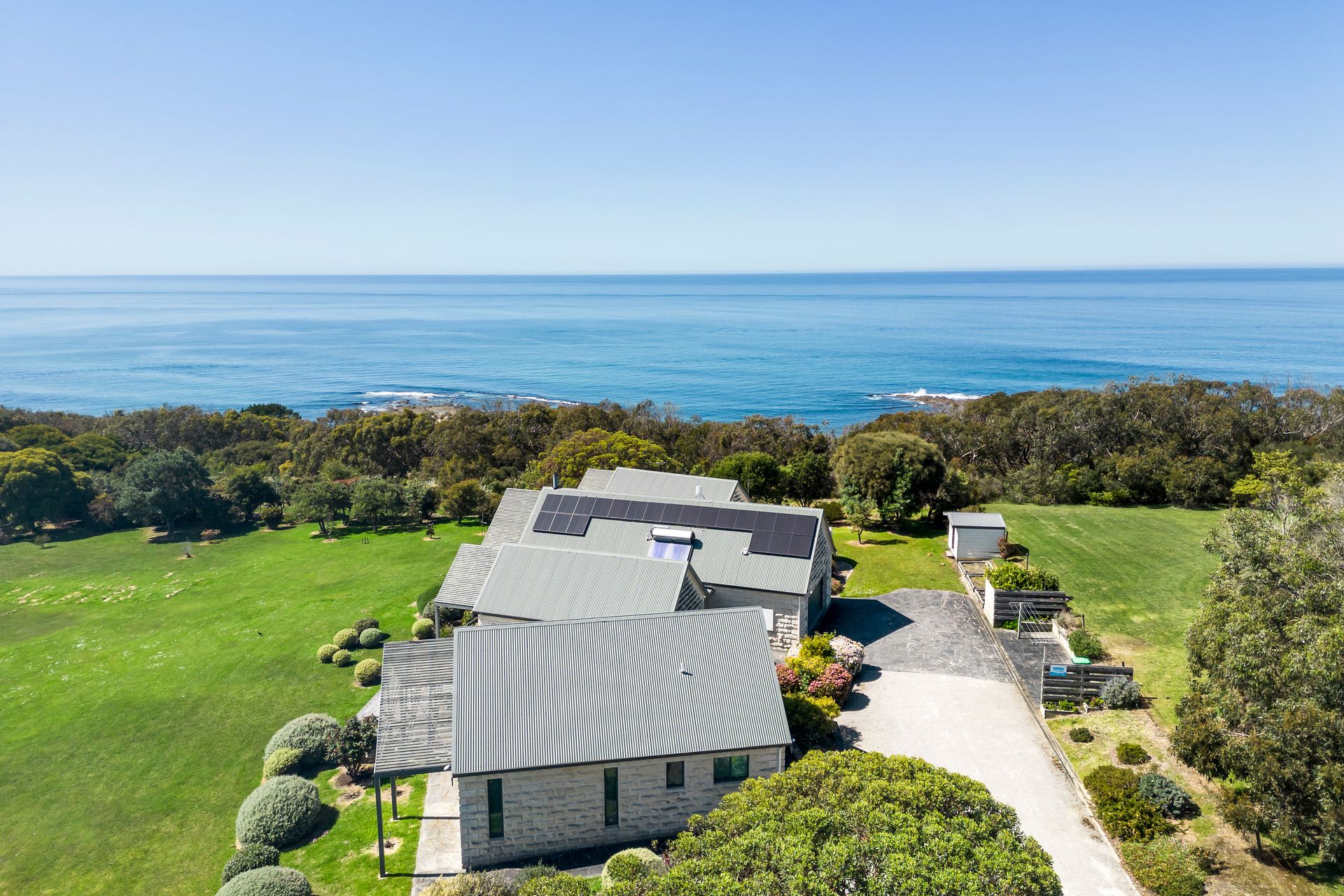 The sandstone home is all on one level, and thoughtfully designed to make the most of the aspect and views to Apollo Bay, Marengo and the surrounding hills. Off a central entry point, there are two wings of the house, with rooms leading onto a front timber deck stretching along the entire length of the house.