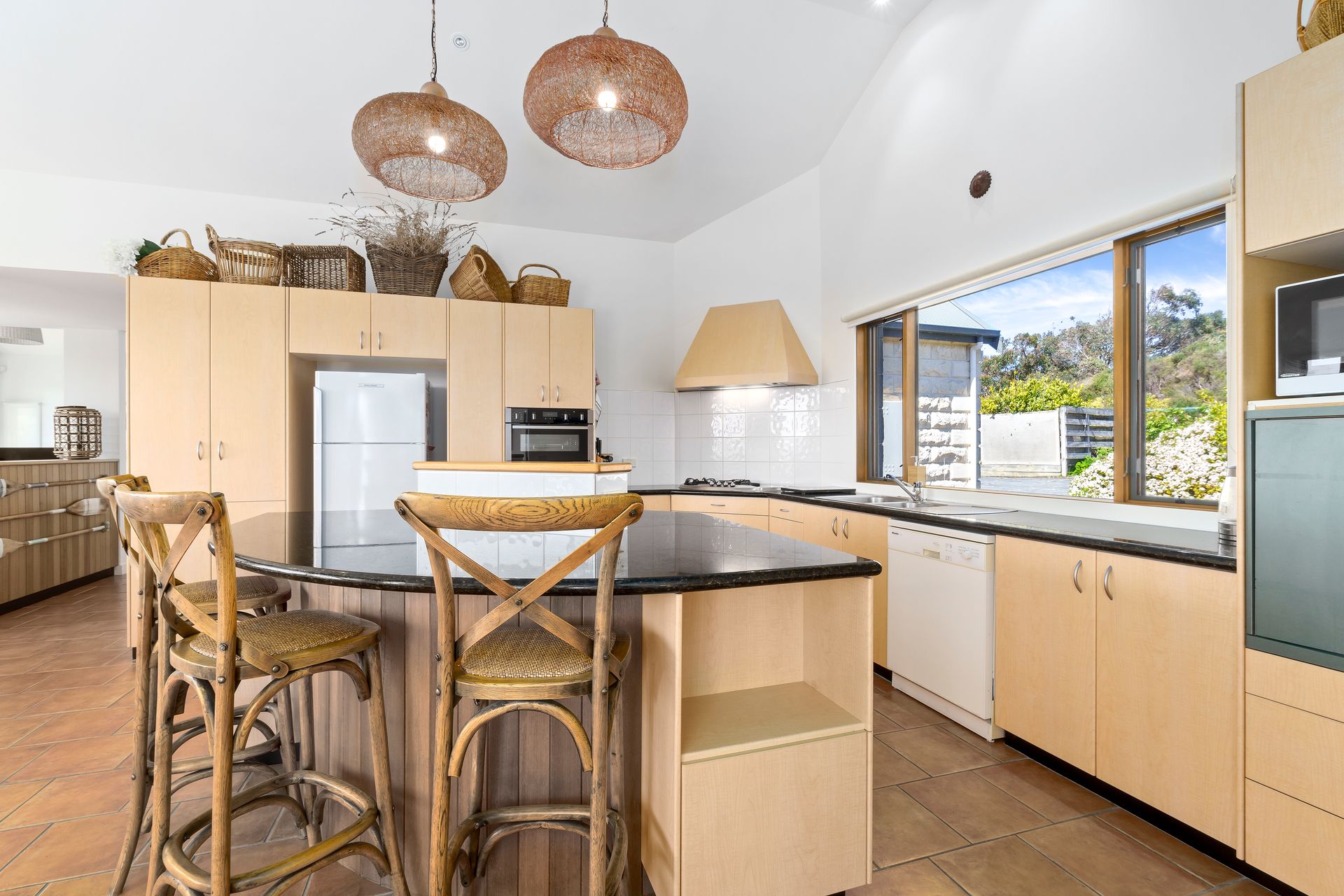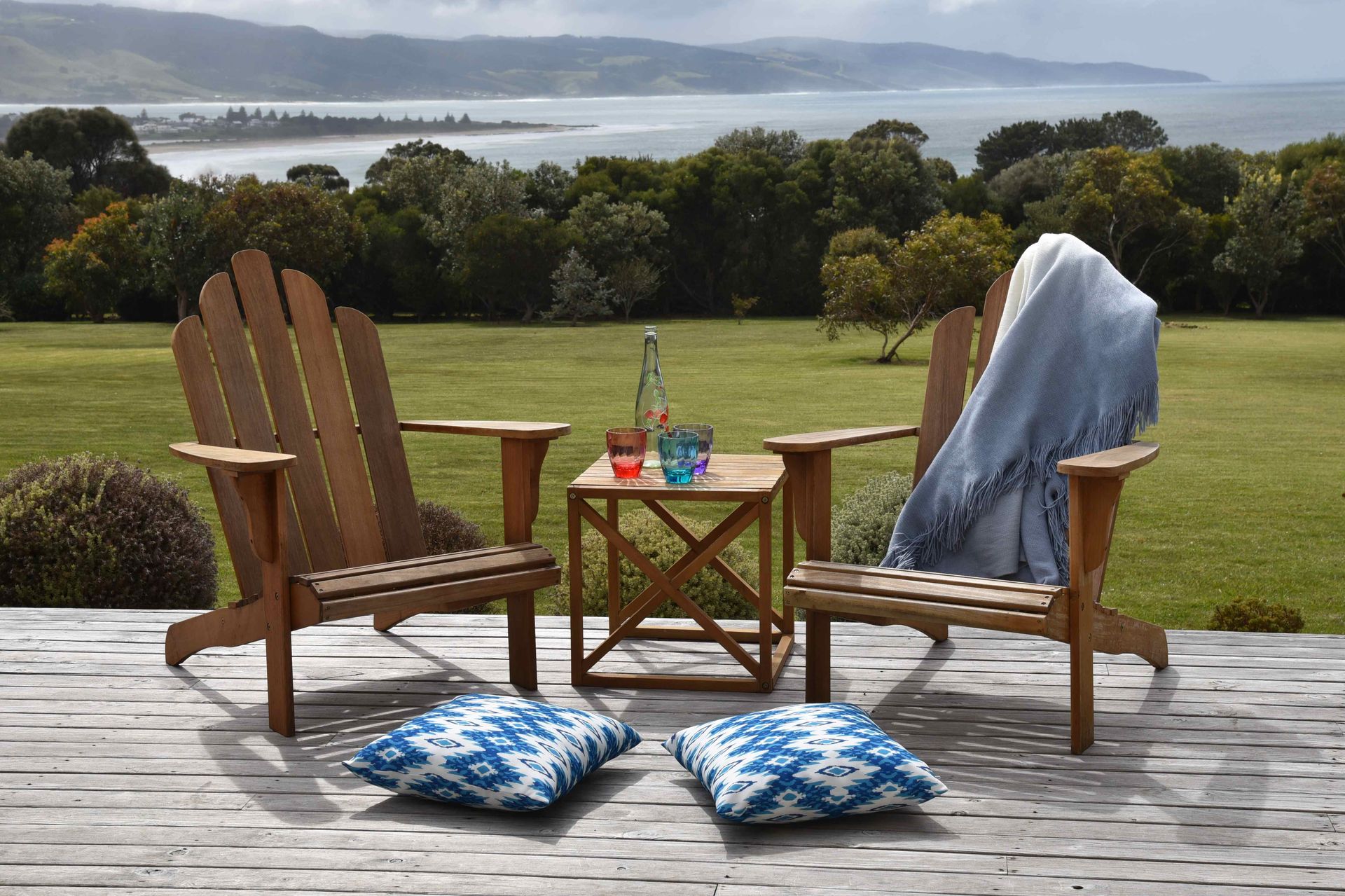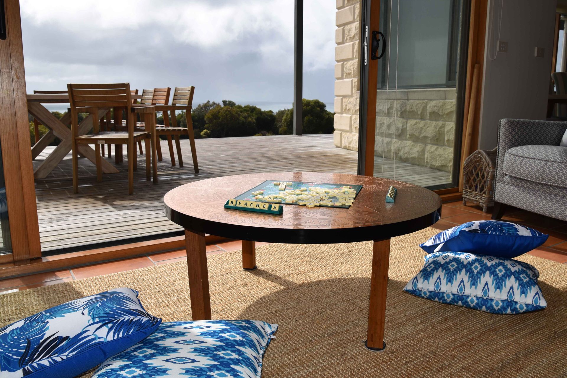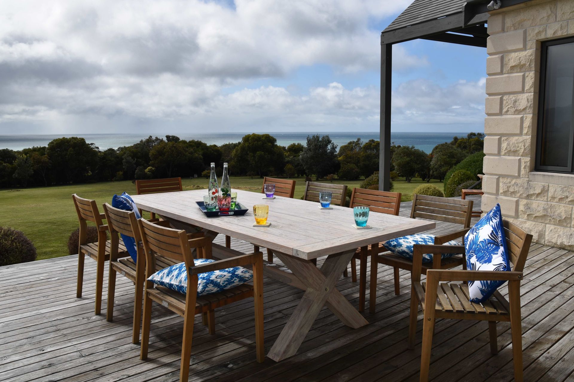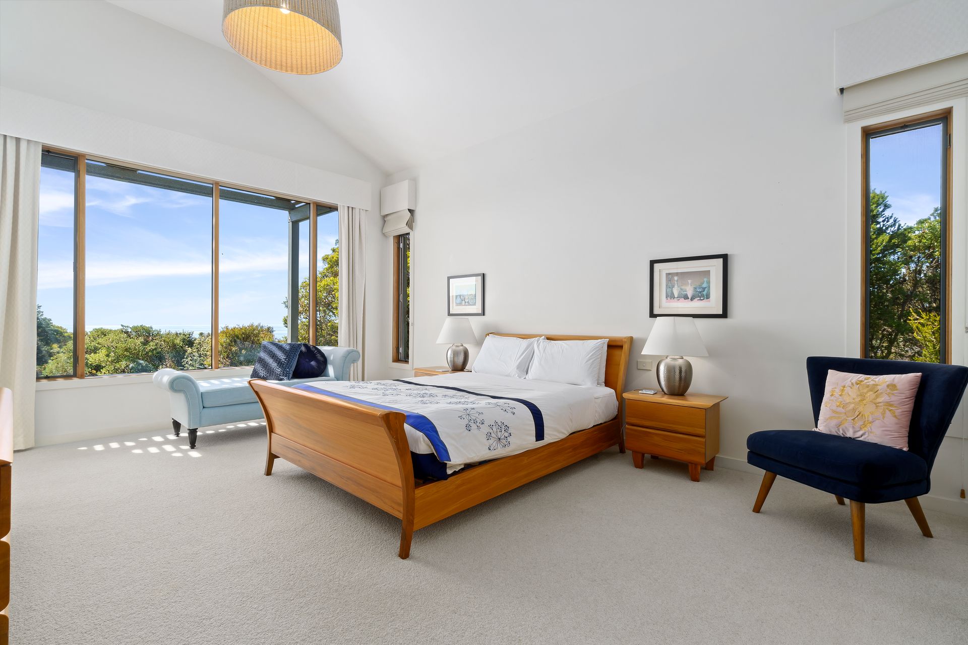 Enter in the house to the open plan kitchen and dining area. The kitchen has gas cooktop, electric oven, dishwasher, microwave, island bench, breakfast bar, cooking equipment and serving ware. A 10 seat dining table provides the space for your holiday meals together, or take it outside on the deck with a dining table setting enjoying the open air and views. Inside, an adjoining sitting room has a wall of books, and double doors opening onto the deck. Further on this wing are two bedrooms, the main bathroom with bath and shower, separate toilet, and laundry room with washing machine and dryer.